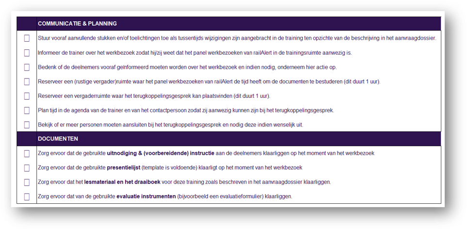 In onderstaande checklist staat precies welke voorbereidende activiteiten je kan nemen en wat van je wordt verwacht tijdens het werkbezoek.
